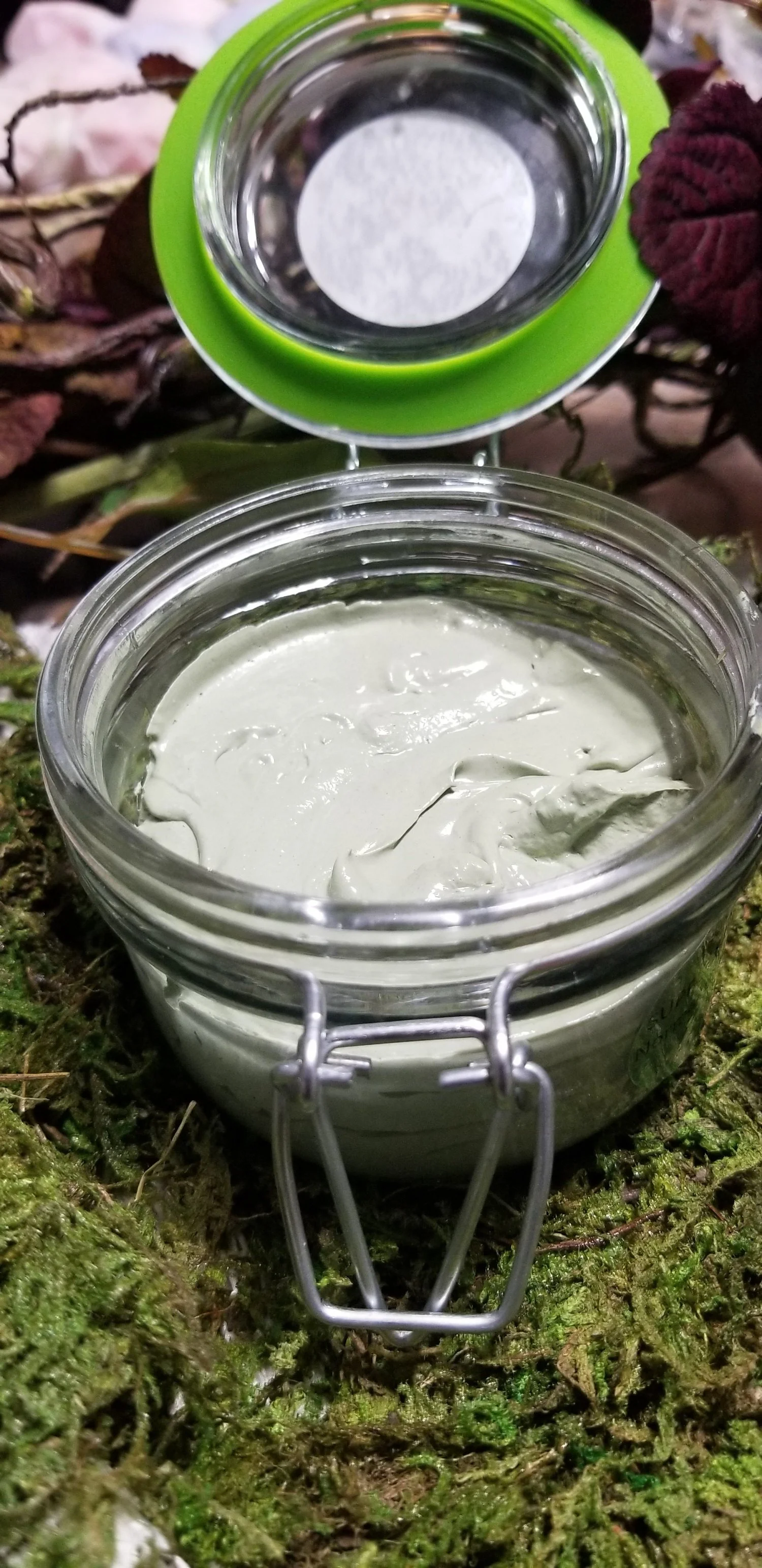 IIngredients: Distilled Rose Water, Kaolin Clay, Green Clay, Avocado Oil, Sunflower Oil, Aloe Extract, Cetearyl Alcohol, BTMS-50, Mango Butter, Yogurt Powder, Banana Powder, Apple Powder, Pumpkin Powder, Rosehip Oil, Hobey, Polysorbate 60, a Proprietary Blend of Essential Oils, and Optiphen (Natural Preservative)